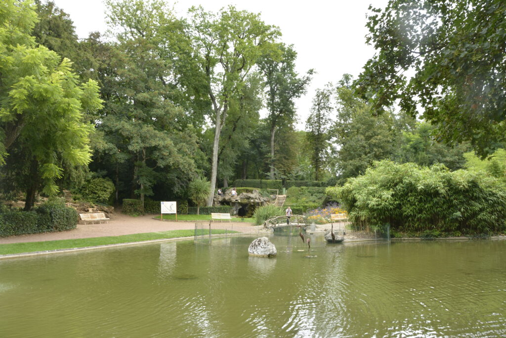 1-Un bassin octogonal d’environ 12 m de diamètre face au kiosque, avec vasque en fonte, naïades et jets d’eau. La pelouse à cet endroit sera totalement supprimée et remplacée par quatre parterres à la française disposés en arc de cercle autour du bassin, avec, en leur milieu, les quatre vases de Sèvres sur piédestal actuellement placés sur les piliers de la grille d’entrée.